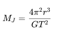 Para calcular la masa de Júpiter podemos usar el movimiento de una de sus lunas, ya que su órbita está determinada por la gravedad del planeta. Sustituyendo en la ecuación de equilibrio orbital, se obtiene la fórmula que permite calcular la masa de Júpiter.